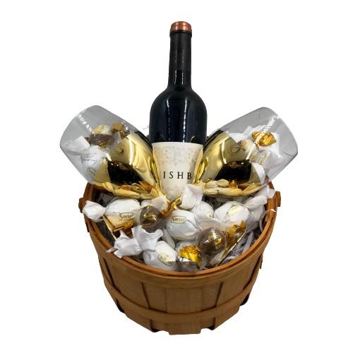 תכולת החבילה תישבי יין אדום יבש 750 מ"ל 2 כוסות זכוכית מעוצבות 20 פרליני שוקולד סוריני אדנית מעוצבת