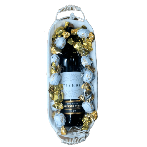 יין תישבי אדום 750 מ”ל 400 גרם פרליני שוקולד סוריני סלסלת מתכת אובלית מעוצבת